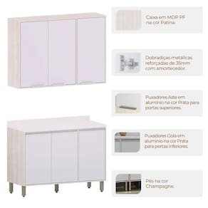 • Pintura: Armário: 5 Prateleiras Interna em Patina FF/Dobradiças Metálicas 35 mm com Amortecimento/3 Puxadores Aba em Alumínio Prata (Anodizado); Balcão: Estrutura e Prateleira em Patina FF/1 Prateleira Interna/3 Puxadores Gola em Alumínio Prata (Anodizado)/Dobradiças Metálicas 35 mm com Amortecimento/Pés na Cor Champanhe;