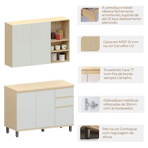 • Pintura: Armário: 4 Prateleiras Interna/Dobradiças Metálicas 35 mm com Amortecimento/2 Puxadores J em MDF 18 mm; Balcão: 1 Prateleira Interna/5 Puxadores J em MDF 18 mm/Pés na Cor Conhaque com Regulagem de Altura;