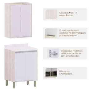 • Pintura: Armário: 1 Prateleira Interna em Patina FF/Dobradiças Metálicas 35 mm com Amortecimento/2 Puxadores Aba em Alumínio Prata (Anodizado); Balcão: Estrutura e Prateleira em Patina FF/1 Prateleira Interna/2 Puxadores Gola em Alumínio Prata (Anodizado)/Dobradiças Metálicas 35 mm com Amortecimento/Pés na Cor Champanhe