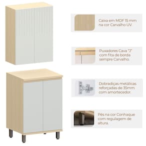 • Pintura: Armário: 1 Prateleira Interna/Dobradiças Metálicas com Amortecimento/2 Puxadores J em MDF 18 mm; Balcão: 2 Puxadores em J em MDF 18mm/1 Prateleira Interna/Pés na Cor Conhaque com Regulagem de Altura;