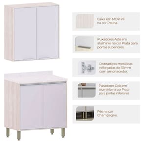 • Pintura: Armário: 1 Prateleira Interna em Patina FF/Dobradiças Metálicas 35 mm com Amortecimento/2 Puxadores Aba em Alumínio Prata (Anodizado); Balcão: Estrutura e Prateleira em Patina FF/1 Prateleira Interna/2 Puxadores Gola em Alumínio Prata (Anodizado)/Dobradiças Metálicas 35 mm com Amortecimento/Pés na Cor Champanhe;