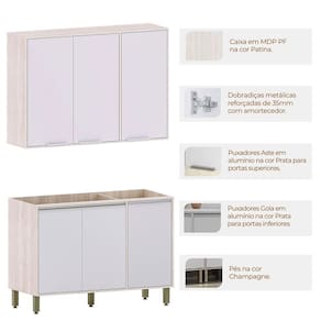 • Pintura: Armário: 5 Prateleiras Interna em Patina FF/Dobradiças Metálicas 35 mm com Amortecimento/3 Puxadores Aba em Alumínio Prata (Anodizado); Balcão: Estrutura e Prateleira em Patina FF/1 Prateleira Interna/3 Puxadores Gola em Alumínio Prata (Anodizado)/Dobradiças Metálicas 35 mm com Amortecimento/Pés na Cor Champanhe;