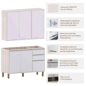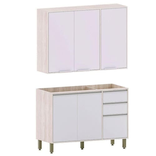 Acompanha o produto: - 1 x Armário Aéreo para Cozinha 120 cm 3 Portas Atenas - 1 x Balcão de Pia para Cozinha 120 cm 2 Portas 3 Gavetas Atenas - Manual de Montagem - Acessórios de Montagem