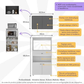 O Kit Armário de Cozinha 2 Portas com Balcão Multiuso Multimóveis MP2238 é a solução perfeita para transformar sua cozinha num ambiente prático e elegante. Produzido em MDP com acabamento acetinado (cerca de 20% de brilho), garante durabilidade e facilidade na limpeza. O armário aéreo possui 2 portas para armazenar louças e suporta até 6kg no seu interior, otimizando o espaço do ambiente. O balcão multiuso dispõe de 2 portas com puxadores em ABS, 1 gaveta ampla com corrediças metálicas, que proporcionam maior leveza no manuseio, além de espaço específico para acomodar forno e micro-ondas. Além disso, conta com pés em polipropileno que oferecem estabilidade ao móvel. As dobradiças metálicas proporcionam maior resistência e qualidade ao kit, para acompanhar você por um longo tempo.