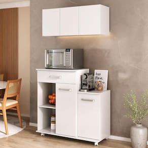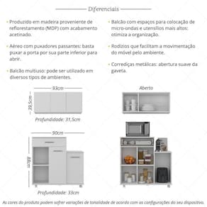 O balcão possui tampo de 15mm, 2 portas e 1 gaveta equipada com corrediças metálicas, que proporcionam mais leveza no manuseio. Além disso, os nichos são ideais para armazenar utensílios de cozinha ou mantimentos, deixando-os ao alcance das mãos. Conta com espaços dedicados para colocação de micro-ondas (até 6kg) e utensílios mais altos, otimizando o espaço da cozinha. Os rodízios facilitam a movimentação do móvel e a limpeza do ambiente.