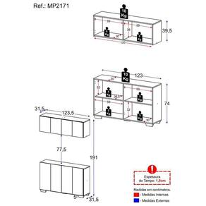 Dimensões do produto montado: Armário Aéreo - Altura: 39,5cm | Largura: 123,5cm | Profundidade: 31,5cm Balcão - Altura: 74cm | Largura: 123cm | Profundidade: 31,5cm *Você pode consultar as medidas detalhadas na imagem técnica do produto.