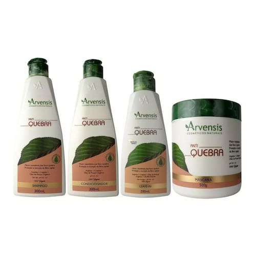Kit arvensis antiquebra shampoo cond leave-in mascara 500gNeste anúncio contém:1 unidade shampoo antiquebra arvensis 300ml1 unidade condicionador antiquebra arvensis 300ml1 unidade leave-in antiquebra arvensis 200ml1 unidade máscara antiquebra arvensis 500g Shampoo anti-quebra arvensis 300ml Composta por uma associação de produtos que restauram e protegem a fibra capilar desde a cutícula até o córtex, a linha anti-quebra trata profundamente os fios, tornando-os mais resistentes à quebra e, consequentemente, à queda. Contém aminoácidos essenciais que, associadas a filtros solares, protegem e devolvem a massa aos cabelos, perdida por processos oxidativos como tinturas, alisamentos temporários e permanentes, radiações uv, calor de secadores e chapinhas, estresse ambiental e tratamentos químicos em geral. Indicação: cabelos quebradiços, principalmente em casos de corte químico. Principais ativos: arginina, creatina e óleo de pracaxi orgânico. Com toque sedoso, o shampoo anti quebra limpa suavemente os cabelos protegendo a raiz e a extensão dos fios, desde a cutícula até o córtex. 300ml - sem sal - ph 5,0 - 5,5 Condicionador anti-quebra arvensis 300ml Composta por uma associação de produtos que restauram e protegem a fibra capilar desde a cutícula até o córtex, a linha anti-quebra trata profundamente os fios, tornando-os mais resistentes à quebra e, consequentemente, à queda. Contém aminoácidos essenciais que, associadas a filtros solares, protegem e devolvem a massa aos cabelos, perdida por processos oxidativos como tinturas, alisamentos temporários e permanentes, radiações uv, calor de secadores e chapinhas, estresse ambiental e tratamentos químicos em geral. Indicação: cabelos quebradiços, principalmente em casos de corte químico. Principais ativos: arginina, creatina e óleo de pracaxi orgânico. Condiciona e restaura a estrutura danificada tornando o fio mais resistente à quebra. Com ação protetora, age no fechamento das cutículas e evita o frizz. 300ml ph 3,5 - 4,5 Leave-in anti-quebra arvensis 200g Composta por uma associação de produtos que restauram e protegem a fibra capilar desde a cutícula até o córtex, a linha anti-quebra trata profundamente os fios, tornando-os mais resistentes à quebra e, consequentemente, à queda. Contém aminoácidos essenciais que, associadas a filtros solares, protegem e devolvem a massa aos cabelos, perdida por processos oxidativos como tinturas, alisamentos temporários e permanentes, radiações uv, calor de secadores e chapinhas, estresse ambiental e tratamentos químicos em geral. Indicação: cabelos quebradiços, principalmente em casos de corte químico. Principais ativos: arginina, creatina e óleo de pracaxi orgânico. O leave-in anti quebra proporciona brilho extra e proteção reforçada contra danos externos. Contém filtro solar. 200ml - ph 4,0 - 4,5 Máscara anti-quebra arvensis 500g Composta por uma associação de produtos que restauram e protegem a fibra capilar desde a cutícula até o córtex, a linha anti-quebra trata profundamente os fios, tornando-os mais resistentes à quebra e, consequentemente, à queda. Contém aminoácidos essenciais que, associadas a filtros solares, protegem e devolvem a massa aos cabelos, perdida por processos oxidativos como tinturas, alisamentos temporários e permanentes, radiações uv, calor de secadores e chapinhas, estresse ambiental e tratamentos químicos em geral. Indicação: cabelos quebradiços, principalmente em casos de corte químico. Principais ativos: arginina, creatina e óleo de pracaxi orgânico. A máscara anti quebra hidrata, nutre e devolve a massa perdida em processos químicos. Aumenta a resistência e elasticidade dos fios, diminuindo as quebras. 500g - ph 4,0 - 4,5