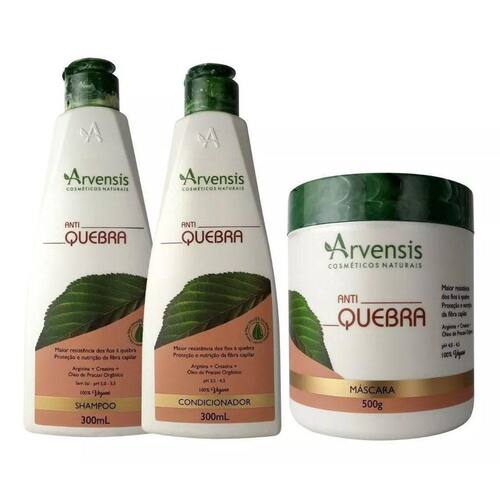 Kit arvensis antiquebra shampoo condicionador máscara 500gNeste anúncio contém:1 unidade shampoo antiquebra arvensis 300ml1 unidade condicionador antiquebra arvensis 300ml1 unidade máscara antiquebra arvensis 500g Shampoo anti-quebra arvensis 300ml Composta por uma associação de produtos que restauram e protegem a fibra capilar desde a cutícula até o córtex, a linha anti-quebra trata profundamente os fios, tornando-os mais resistentes à quebra e, consequentemente, à queda. Contém aminoácidos essenciais que, associadas a filtros solares, protegem e devolvem a massa aos cabelos, perdida por processos oxidativos como tinturas, alisamentos temporários e permanentes, radiações uv, calor de secadores e chapinhas, estresse ambiental e tratamentos químicos em geral. Indicação: cabelos quebradiços, principalmente em casos de corte químico. Principais ativos: arginina, creatina e óleo de pracaxi orgânico. Com toque sedoso, o shampoo anti quebra limpa suavemente os cabelos protegendo a raiz e a extensão dos fios, desde a cutícula até o córtex. 300ml - sem sal - ph 5,0 - 5,5 Condicionador anti-quebra arvensis 300ml Composta por uma associação de produtos que restauram e protegem a fibra capilar desde a cutícula até o córtex, a linha anti-quebra trata profundamente os fios, tornando-os mais resistentes à quebra e, consequentemente, à queda. Contém aminoácidos essenciais que, associadas a filtros solares, protegem e devolvem a massa aos cabelos, perdida por processos oxidativos como tinturas, alisamentos temporários e permanentes, radiações uv, calor de secadores e chapinhas, estresse ambiental e tratamentos químicos em geral. Indicação: cabelos quebradiços, principalmente em casos de corte químico. Principais ativos: arginina, creatina e óleo de pracaxi orgânico. Condiciona e restaura a estrutura danificada tornando o fio mais resistente à quebra. Com ação protetora, age no fechamento das cutículas e evita o frizz. 300ml ph 3,5 - 4,5 Máscara anti-quebra arvensis 500g Composta por uma associação de produtos que restauram e protegem a fibra capilar desde a cutícula até o córtex, a linha anti-quebra trata profundamente os fios, tornando-os mais resistentes à quebra e, consequentemente, à queda. Contém aminoácidos essenciais que, associadas a filtros solares, protegem e devolvem a massa aos cabelos, perdida por processos oxidativos como tinturas, alisamentos temporários e permanentes, radiações uv, calor de secadores e chapinhas, estresse ambiental e tratamentos químicos em geral. Indicação: cabelos quebradiços, principalmente em casos de corte químico. Principais ativos: arginina, creatina e óleo de pracaxi orgânico. A máscara anti quebra hidrata, nutre e devolve a massa perdida em processos químicos. Aumenta a resistência e elasticidade dos fios, diminuindo as quebras. 500g - ph 4,0 - 4,5