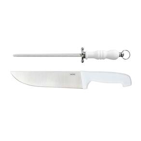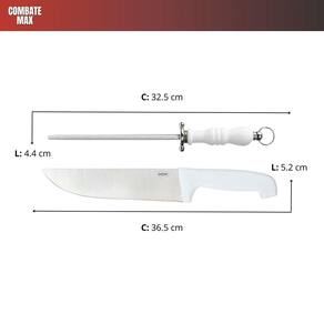 O Kit Assador MOR e ideal para quem aprecia um bom churrasco e quer garantir a melhor experiencia na preparacao e corte das carnes. Inclui uma faca e uma chaira, ambas com cabos brancos e confeccionadas com materiais de alta qualidade.
