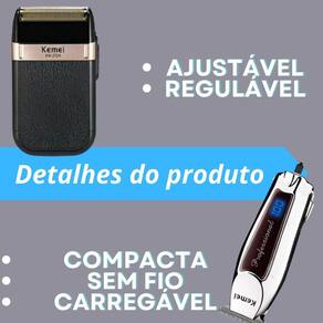Kit Avançado Masculino: Barbeador Kemei 2024 e Máquina 9164 Transforme sua rotina de cuidados pessoais com o Kit Completo Kemei, que inclui a Máquina de Corte KM-9164 e o Barbeador Elétrico KM-2024. Este conjunto é perfeito para quem busca precisão, praticidade e versatilidade, seja para uso doméstico ou profissional. KM-9164: Uma máquina de corte multifuncional, ideal para cabelo, barba e corpo, com lâmina afiada que garante um acabamento perfeito sem danificar a pele. Portátil e recarregável via USB, proporciona uma experiência de barbearia no conforto da sua casa. KM-2024: Barbeador elétrico recarregável, projetado especialmente para peles sensíveis. Com lâminas duplas, oferece um barbear mais rápido e menos agressivo, evitando irritações. Ideal para pessoas alérgicas a lâminas tradicionais. Conteúdo da Embalagem: KM-9164 Máquina de Corte: 1 Máquina KM-9164 1 Carregador Bivolt 3 Pentes de Limite 1mm, 2mm, 3mm 1 Óleo Lubrificante 1 Escova para Limpeza Manual de Instruções KM-2024 Barbeador Elétrico: 1 Barbeador KM-2024 1 Cabo USB 1 Escovinha de Limpeza 1 Bolsa 1 Tampa Protetiva Manual Características: KM-9164: Excelente para acabamentos profissionais Multiuso: cabelo, barba e corpo Design moderno, antiderrapante e portátil Recarregável via USB Corte afiado e silencioso para maior conforto KM-2024: Ideal para peles sensíveis Menos agressivo, evitando irritações Recarregável via USB Lâminas duplas para um corte mais eficiente Fácil de transportar com bolsa inclusa Especificações: KM-9164: Modelo: KM-9164 Display Digital Tempo de carga: 180 minutos para 2 horas de uso Potência: 5W Tensão: 110V/240V do vendedor: 1 mês KM-2024: Modelo: KM-2024 Tempo de Recarga: 8 Horas Tempo de Uso: 60 Minutos Potência Motor: 3W Principais Perguntas Sobre o Produto e Respostas: O KM-9164 é adequado para cortes de cabelo, barba e corpo Sim, é um aparelho multiuso, ideal para cortes de cabelo, barba e depilação corporal. O KM-2024 é bom para peles sensíveis Sim, é ideal para pessoas que têm alergia a lâminas tradicionais, oferecendo um barbear menos agressivo. Quanto tempo dura a carga da bateria do KM-9164 A bateria leva aproximadamente 180 minutos para carregar e oferece cerca de 2 horas de uso contínuo. Quanto tempo leva para recarregar o KM-2024 e qual é a sua autonomia de uso O KM-2024 leva 8 horas para uma carga completa e oferece 60 minutos de uso contínuo. Posso carregar os aparelhos em qualquer entrada USB Sim, ambos os dispositivos são recarregáveis via USB, facilitando o uso em qualquer lugar.
