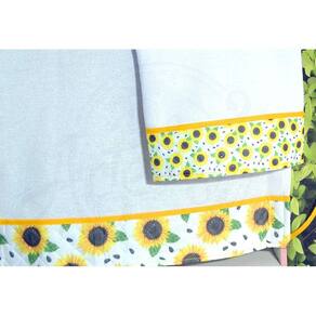 Avental fabricado em tecido matelado e estampado na parte da frente e plástico leitoso na parte de trás, com estampas de girassol, em tons de amarelo, branco, preto e verde, com bolso frontal e acabamento em viés na cor amarelo , pano de prato na cor branco com barrado matelado com estampas de girassol e detalhes em viés na cor amarelo.