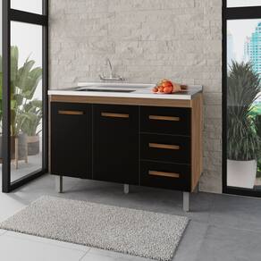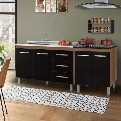 Produzidos em MDP, os balcões oferecem boa durabilidade e resistência para o uso diário. O design funcional conta com prateleiras internas, facilitando a organização de utensílios e produtos. As corrediças metálicas e as alças plásticas complementam o acabamento, garantindo um conjunto prático e eficiente.