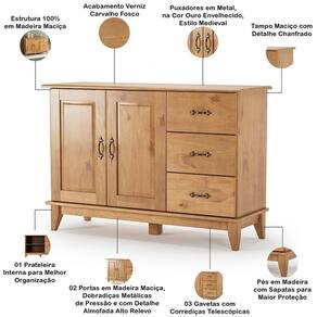 Máxima organização para sala de jantar. Este conjunto potente associa o Balcão Buffet 120cm, de grande capacidade com 3 gavetas e 2 portas a um Aparador Rústico funcional de 2 gavetas. Armazene tudo, de talheres a jogos de jantar, mantendo a estética rústica e coesa da Linha Lira. Além disso, surpreenda-se com a robustez da madeira maciça e com os detalhes em tonalidade ouro envelhecido, que criam uma atmosfera de requinte campestre. Enfim, móveis rústicos para sala de jantar com beleza robusta que abriga suas histórias. Adquira já o seu!