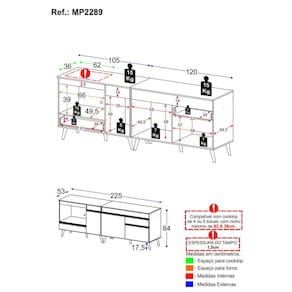 Especificações Técnicas: Dimensões do Produto Montado - Altura: 84cm | Largura: 225cm | Profundidade: 53cm Espaço para Forno - Altura: 39cm | Largura: 66cm | Profundidade: 49,5cm Tamanho Máximo do Nicho para Cooktop: 62x36cm Material: MDP Acabamento: Acetinado Espessura do Tampo: 15mm Puxadores: ABS Pés: Polipropileno Corrediças: Metálicas Balcão Compatível com Cooktop: Sim Nicho para Forno: Sim Balcão Compatível com Pia: Não