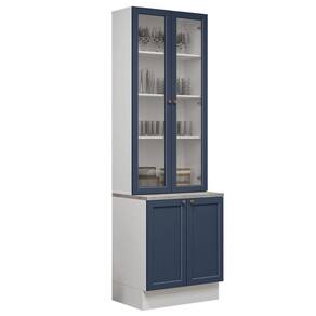 O acabamento de alta resistência da estrutura é em Branco, das frentes em Azul e possui uma textura suave ao toque. O destaque fica por conta do detalhe chanfrado das frentes, que forma molduras elegantes e dá profundidade ao design, refletindo o estilo americano com um toque moderno. Outro diferencial está nos puxadores ponto em ouro envelhecido, feitos com metal resistente, trazem personalidade e um charme único.