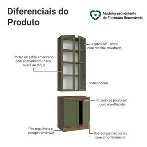 O acabamento de alta resistência da estrutura é em tom amadeirado Rustic, das frentes em Verde e possui uma textura suave ao toque. O destaque fica por conta do detalhe chanfrado das frentes, que forma molduras elegantes e dá profundidade ao design, refletindo o estilo americano com um toque moderno. Outro diferencial está nos puxadores ponto em ouro envelhecido, feitos com metal resistente, trazem personalidade e um charme único.
