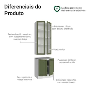 O acabamento de alta resistência da estrutura é em Branco, das frentes em Verde e possui uma textura suave ao toque. O destaque fica por conta do detalhe chanfrado das frentes, que forma molduras elegantes e dá profundidade ao design, refletindo o estilo americano com um toque moderno. Outro diferencial está nos puxadores ponto em ouro envelhecido, feitos com metal resistente, trazem personalidade e um charme único.