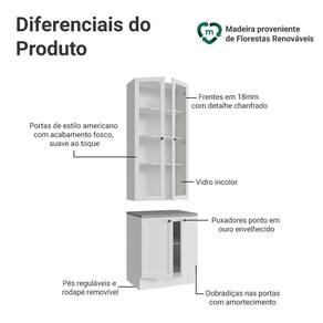 O acabamento de alta resistência da estrutura e das frentes é em Branco e possui uma textura suave ao toque. O destaque fica por conta do detalhe chanfrado das frentes, que forma molduras elegantes e dá profundidade ao design, refletindo o estilo americano com um toque moderno. Outro diferencial está nos puxadores ponto em ouro envelhecido, feitos com metal resistente, trazem personalidade e um charme único.