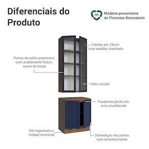 O acabamento de alta resistência da estrutura é em tom amadeirado Rustic, das frentes em Azul e possui uma textura suave ao toque. O destaque fica por conta do detalhe chanfrado das frentes, que forma molduras elegantes e dá profundidade ao design, refletindo o estilo americano com um toque moderno. Outro diferencial está nos puxadores ponto em ouro envelhecido, feitos com metal resistente, trazem personalidade e um charme único.