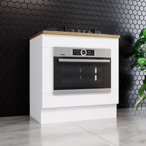 O tampo superior e proprio para instalacao de cooktop, proporcionando acabamento uniforme e integracao perfeita entre os eletros. Uma solucao completa para quem deseja montar uma cozinha modulada funcional, moderna e bem distribuida.