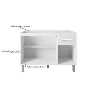 Altura com pés: 83,5 cm Altura sem pés: 67 cm Largura: 118 cm Profundidade: 50 cm Compatível com pia de 120 cm. Possui 5 pés plásticos reguláveis, com altura mínima de 16,5 cm e ajuste até 18 cm. Produto não acompanha tampo.