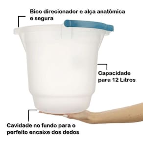 Balde com design clássico e robusto: alça larga que facilita o manuseio, bico direcionador e escala medidora de VOLUME DA CAIXA ideal para medir o consumo adequado em cada tarefa diária.