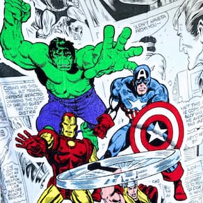 Fundada nos anos 30, a Marvel se consolidou como uma das principais editoras De quadrinhos do mundo e marcou a história com seus personagens. Podemos ver na estampa os famosos Vingadores: Hulk, Homem de Ferro, Thor Tirinhas do amavel mundo MARVEL COMICS.