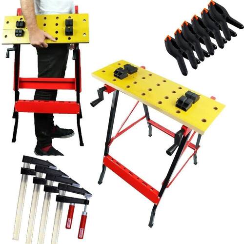 Kit Bancada De Ferramentas + 4 Grampo Sargento F + 6 Grampos Multiuso 6 Polegadas Incluso4 Sargento para marceneiro 80 X 250 - Starfer6 Grampo multiuso 6 Polegadas - Starfer1 Bancada ajustável - StarferA Bancada de Trabalho Marceneiro é ideal para uso leve em marcenarias ou trabalhos de hobby, indicado para lixamento, pintura e outros. Seu design dobrável e portátil, garante praticidade na hora de ser utilizada. - Bancada portátil de trabalho e ferramentas;- Com barra transversal onde pode ser utilizado como porta ferramentas;- Ideal para trabalhos como lixar, pintar, apoiar, prensar, servir de suporte, entre outros;- Bancada de trabalho ajustável portátil dobrável em alumínio com tampo de madeira;- Presilhas ajustáveis e régua;- Com manivelas para ajuste do tampo de madeira.- Possui 4 mordentes ajustáveis manualmente para fixação.CARACTERÍSTICAS TÉCNICAS:Material: Alumínio e madeira.Medidas bancada: 75cm altura x 61cm largura x 41cm comprimento .Medidas tampo: 24cm largura x 56cm comprimento .Capacidade máxima: 65kg.Marca: StarferRef.: 2002809Sargento para Marceneiro Ajustável em Aço Forjado.Sargento para marceneiro Starfer é ideal para a fixação de madeiras e peças em diversas atividades.Indicado para utilização em carpintarias e marcenarias, em fixação de peças, montagem de móveis, entre outros. Abertura: 80mm Comprimento: 250mmQuantidade: 4 PeçasRef.: 12804504Marca: StarferGrampo multiuso para marceneiro 6 polegadas é ideal para prender peças de madeira, facilitando o trabalho. Grampo Multiuso Starfer utilizado para manter materiais pressionados durante colagens, perfurações e montagens de peças a ferramenta certa para você que trabalha na construção civil ou com pequenos reparos. Ferramenta essencial para um trabalho com finalização perfeita, de fácil Manuseio, com mordentes de plástico articulados, fabricado em material de alta performance e cabo com sistema de mola.Características:Fácil Manuseio;Cabo com sistema de mola;Mordentes de plásticos Nylon articulados;Fabricado em material de alta performance Tamanho: 6 150mm Abertura máxima 60mm Embalagem com 6 unidades.Marca: StarferRef.: 7012187