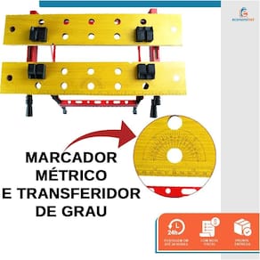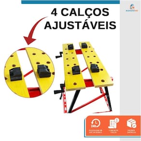 - Bancada portátil de trabalho e ferramentas; - Com barra transversal onde pode ser utilizado como porta ferramentas; - Ideal para trabalhos como lixar, pintar, apoiar, prensar, servir de suporte, entre outros; - Bancada de trabalho ajustável portátil dobrável em alumínio com tampo de madeira; - Presilhas ajustáveis e régua; - Com manivelas para ajuste do tampo de madeira. - Possui 4 mordentes ajustáveis manualmente para fixação.