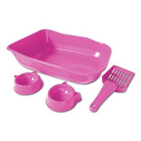 - Indicado para gatos; - Vem com uma pazinha, dois comedouros com tamanho ideal e quantidade na dose certa de ração para o gato; - Possui design arrojado e diferenciado; - Fabricado para que o gato não derrube areia no chão; - Desenvolvido com plástico reciclado resistente e durável; - Kit contém 4 peças.