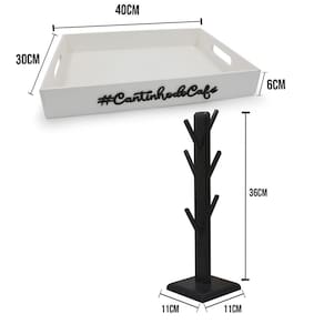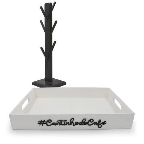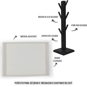 Kit bandeja cantinho do café porta xícaras suporte 6 pinos b Bandeja versátil e multiuso: Feita em mdf de 6mm com pintura em tinta acrílica na cor preta ela é ideal para organizar o seu lar, servir um cafezinho para os amigos, organizar papeis de escritório entre diversas outras utilidades. Bandeja versátil, barata e de qualidade, combinando com todos os ambientes no qual estiver Suas medias são40x30x6 (externa)38,5 x 28,5 x 5,5 (na parte interna) Possui as laterais vazadas como uma alça. Porta xícaras 6 pinos:Esse é o produto ideal para decorar o seu tão especial cantinho do café ou até mesmo presentear uma pessoa querida, além da beleza o porta xícaras é feito em mdf que é muito resistente, ideal até 6 xícaras/canecas de 240ml. Com esse porta xícaras você vai conseguir deixar seus armários muito mais organizados. Medidas suporte:Altura: 36 cmBase: 11x11Peso: 282gMaterial de composição: mdf Obs: xícaras e porta capsulas não inclusos