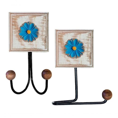 Kit Banheiro 2 Peças 1 Toalheiro Duplo + 1 Porta Papel Higiênico Artesanal Flor Madeira Cor Azul