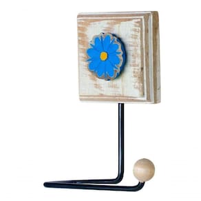 Kit Banheiro 2 Peças. 1 Toalheiro Duplo + 1 Porta Papel Higiênico Artesanal Flor Madeira Cor Azul