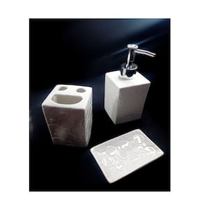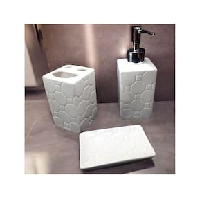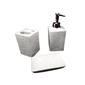 Produto em Destaque: Kit Banheiro 3 Peças. Conjunto para banheiro , peças branca com detalhe em alta relevo e detalhes cromado.