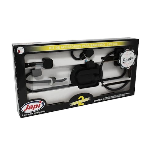Kit Banheiro 5Pçs Saboneteira Cabide Papeleira Preto Japi A linha Samba é composta por um mix completo de produtos para organizar e dar praticidade para sua casa além de design prático que harmoniza com outros elementos do ambiente. Kit composto por: - 1 cabide simples - 1 saboneteira - 1 papeleira com tampa - 1 porta toalha argola - 1 porta toalha . Composição básica: Plásticos de engenharia, PS e alumínio. Medidas: 44 x 22 x 5 cm. Marca: Não Informado Ean: 7894023135985