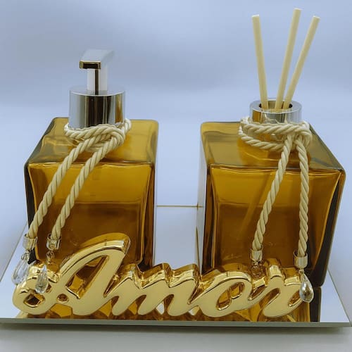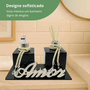 Kit Banheiro - Decoriatto O Kit Banheiro Decoriatto combina funcionalidade e sofisticação para deixar banheiros e lavabos mais elegantes. Com frascos de vidro branco fosco, acabamento prime e detalhes em corda, o conjunto é disposto sobre uma bandeja espelhada e acompanhado de mini suculenta artificial e palavra decorativa, criando um visual moderno e acolhedor. Composição: 1 Frasco saboneteira de vidro branco fosco com tampa Prime R28/410 e detalhe em corda decorativa. 1 Frasco difusor de vidro branco fosco com tampa Prime R28/410, varetas e detalhe em corda decorativa. 1 Bandeja espelhada retangular. 1 Mini suculenta artificial em vaso branco. 1 Palavra decorativa. Diferenciais: Design moderno e sofisticado. Ideal para presentear ou compor a decoração. Peças de alta qualidade. Marca: Não Informado Ean: 7901041405478
