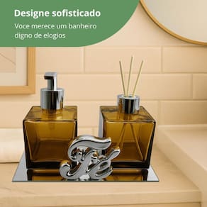 Kit Banheiro - Decoriatto O Kit Banheiro Decoriatto une elegância e praticidade para transformar banheiros e lavabos em ambientes sofisticados. Com frascos de vidro branco fosco, acabamento prime e detalhe em corda decorativa, o conjunto é disposto sobre uma bandeja espelhada e acompanhado de palavra decorativa e mini suculenta artificial, criando um visual moderno e harmonioso. Composição: 1 Frasco saboneteira de vidro branco fosco com tampa Prime 1 Frasco difusor de vidro branco fosco com tampa Prime e 3 varetas 1 Bandeja espelhada retangular. 1 Palavra decorativa. Diferenciais: Design sofisticado e atemporal. Ideal para decorar ou presentear. Materiais de alta qualidade. Marca: Não Informado