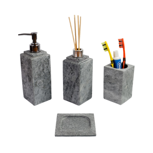 Kit Banheiro Bancada Lavabo Luxo em Pedra Sabão N04 Prata Um difusor ajuda a quebrar o óleo essencial de suaescolha em milhões de partículas minúsculas, quecriam um vapor de água fino que se espalha por todoo seu espaço rapidamente. Na verdade, levará apenasalguns minutos para que toda a sala seja impregnadapelo aroma que você preferir. O porta sabonete líquido é uma criação muito prática eeficaz para o dia a dia. Afinal, no momento em quelavamos as mãos, basta apertar o porta sabonete líquidoe teremos a quantidade necessária de sabonete paraensaboarmos. O porta-escovas de dentes é um acessório muitocomum nos banheiros para acomodar as escovasde dentes, creme dental, e até outros objetos. Como o próprio nome diz, porta treco serve paraguardar de tudo. Lápis, borracha, giz de cera,sabonete, joias, anéis e tudo mais que quisermos,ajudando a organizar as coisas. Especificações Técnicas Porta Sabonete Líquido:Altura da Pedra: 16cm.Altura Total: 22cm.Litragem: 250ml.Largura: 7cm.Peso: 1,1Kg. Especificações Técnicas Difusor:Altura até na Pedra: 13cm.Altura Total: 16cm.Largura: 7cm.Peso: 0,930g. Especificações Técnicas Porta Escova de Dente:Diâmetro Furo Escova: 5cm.Largura: 7cm.Peso: 0,760g.Altura 11cm. Especificações Técnicas Porta Treco Raso:Comprimento: 15cm.Largura: 12cm.Peso: 0,620g.Altura: 2cm. Itens Inclusos:01 Porta Treco Saboneteira Petisco Multifunção Pedra Sabão Raso.01 Porta Sabonete Líquido Dispenser em Pedra Sabão Prata 22x7cm.01 Difusor Vareta Essências Aromas Banheiro Ambiente Prata 7cm.01 Porta Escova de Dente Pia Bancada em Pedra Sabão 11x7cm. Código: 013+014+016+018-INDSJ.
