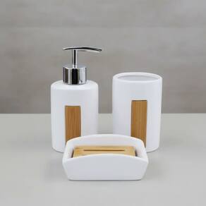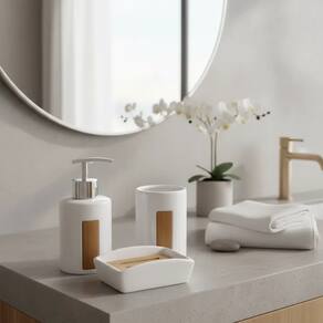 Fabricado em cerâmica de alta qualidade, este kit combina a elegância do branco com o acabamento em bambu natural, criando uma estética acolhedora, minimalista e sofisticada ao mesmo tempo. Ideal para banheiros e lavabos que prezam por um toque de natureza e equilíbrio visual no ambiente.