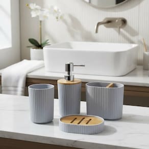 Jogo de Banheiro com 4 Peças em Plástico e Bambu – Funcionalidade e Estilo Natural para o Seu Banheiro