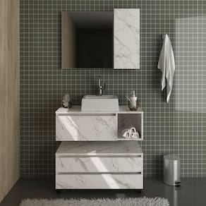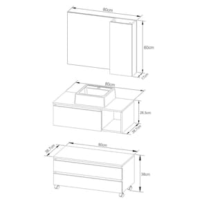 O Kit para Banheiro é a escolha ideal para transformar o seu espaço em um ambiente elegante e organizado. Com um design atual, ele oferece não apenas beleza, mas também funcionalidade, contribuindo para um banheiro agradável e útil. Produzido com materiais de alta qualidade, o kit garante durabilidade e resistência, criando um ambiente harmonioso e agradável para o seu dia a dia. CARACTERÍSTICAS TÉCNICAS: - Produzida em MDP de 15 mm - Acabamento UV na cor Mármore Branco - Acompanha Espelho - Cuba em Mármore Sintético - Portas com Dobradiça Metálica e Articulador - Gavetas com Corrediça Metálica - Puxador tipo Cava - Pés em Rodízios Plásticos *Kit Composto por Gabinete Suspenso (3601), Gabinete com Rodízios (3603), Espelheira (3602) e Cuba (3630) INFORMAÇÕES TÉCNICAS: 3601: Alt. 26,5 x Larg. 80 x Prof. 38,7 cm P. 10,8 kg 3603: Alt. 38 x Larg. 80 x Prof. 38,7 cm P. 14,75 kg 3602: Alt. 60 x Larg. 80 x Prof. 17 cm P. 12 kg 3630: Alt. 11,5 x Larg. 35 x Prof. 34 cm P. 5,5 kg INFORMAÇÕES ADICIONAIS: - ATENÇÃO: Não trabalhamos e não nos responsabilizamos pela montagem do móvel. Antes da montagem conferir se o produto está de acordo com o que comprou, produto montado e danificado pela montagem não será aceito troca. Montagem e instalação por conta do comprador. - As imagens ambientadas são meramente ilustrativas e podem apresentar itens que não compõe o produto. As cores do produto podem variar de acordo com o monitor, a iluminação do ambiente ou sua percepção visual. - Limpeza: Deve ser feita com pano macio e seco ou levemente. Não devem ser utilizados abrasivos como palha de aço e objetos cortantes. Garantia para defeitos de fabricação conforme Código de Defesa do Consumidor.