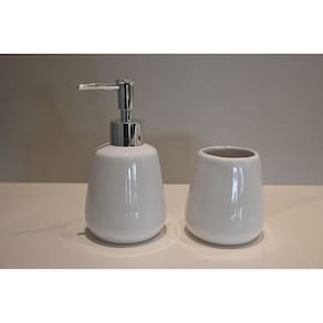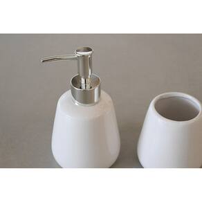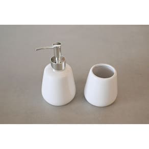 Nada melhor do que ter um banheiro organizado e com objetos proporcionando beleza ao ambiente não é mesmo Pensando nisso, a jolitex criou o kit banheiro branco em dois modelos diferentes para completar a decoração do seu banheiro. O kit possui 2 peças de cerâmica, sendo um dispenser para sabonete líquido e um pote para organização de itens da sua preferência, tornando o ambiente mais organizado e prático para o seu dia-a-dia e da sua família. A cor branca combina com qualquer decoração, além de dar um toque de requinte ao ambiente.