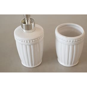 Nada melhor do que ter um banheiro organizado e com objetos proporcionando beleza ao ambiente não é mesmo Pensando nisso, a jolitex criou o kit banheiro branco em dois modelos diferentes para completar a decoração do seu banheiro. O kit possui 2 peças de cerâmica, sendo um dispenser para sabonete líquido e um pote para organização de itens da sua preferência, tornando o ambiente mais organizado e prático para o seu dia-a-dia e da sua família. A cor branca combina com qualquer decoração, além de dar um toque de requinte ao ambiente.