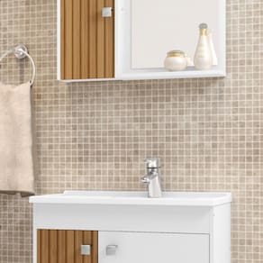 A Bechara desenvolveu um Kit Banheiro Gabinete 56cm Pia e Armário com Espelho Munique Branco/Ripado, pensando em você que deseja organizar seu banheiro deixando-o mais bonito e prático. Confira as características deste kit incrível!!Composto por lavatório em mármore sintético, armário superior, espelheira e gabinete. Já a sua estrutura é garantida, elaborada em MDF 12mm. Possui 3 Portas com dobradiças metálicas e puxadores cromados. A pintura da superfície em verniz poliéster semi-brilho, com secagem UV e impressão a laser, com acabamento com textura em alto relevo, agregando qualidade e durabilidade ao produto.Um show né! Então não perca essa oportunidade e adicione seu Kit Gabinete de banheiro agora mesmo ao seu carrinho!Dimensões dos Produtos (Largura x Altura x Profundidade)Armário e Espelheira: 57,50 x 46 x 10 cm.Gabinete: 56 x 54 x 29,60 cm.Cuba: 59 x 2 x 31 cm.Peso: 16,53 Kg.Características do ProdutoMaterial da Estrutura: MDF.Material da Cuba: Mármore sintético/PRFV (Polímero Reforçado com Fibra de Vidro).Acabamento: Pintura UV.Escala de Brilho: Semi Brilho.Quantidade de Portas: 3 Portas.Tipo de Porta: Convencional.Tipo de Dobradiças: Metálicas.Tipo de Puxador: Plástico com acabamento cromado.Possui Prateleiras: Sim.Possui Espelho: Sim.Possui Pés: Não.Diferenciais:- Acabamento com textura em alto relevo.- 3 Prateleiras.- NÃO ACOMPANHA TORNEIRA.Sistema de Montagem: Cavilhas, Parafusos, Suportes Metálicos.Manual de Montagem: Sim.Complexidade da Montagem: Baixa.Volumes: 2 Volumes.Conteúdo da Embalagem: 1 Espelheira, 1 Armário Superior, 1 Cuba, 1 Gabinete.Garantia do Fabricante: 90 dias contra defeito de fabricação.Montagem: Recomendamos que seja feita por um profissional.Recomendação de Limpeza: Utilize pano levemente úmido.Observações importantes:- Produto para uso residencial em ambiente interno, não devendo ficar exposto diretamente ao sol, calor e umidades excessivas.- Pode haver alguma diferença de tonalidade entre a imagem e o produto real, por conta do tratamento de imagens e a calibração de cores do seu monitor.- As imagens são meramente ilustrativas, não acompanham objetos de decoração e eletrônicos.- Confira o estado da embalagem, não devendo assinar o comprovante em caso de danos.- Não asseguramos, no ato da entrega, por subir escadas/elevadores, pelo transporte por guincho em apartamentos ou montagem, desmontagem e instalações. Eventuais despesas são por conta do comprador.- Confira as dimensões do produto e certifique-se de que passará normalmente por supostos elevadores, portas, escadas e/ou corredores de sua residência.