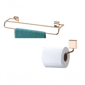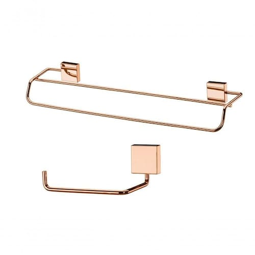 Kit Banheiro Lavabo 2 Peças Rosé Gold Future Porta Toalha Banho Duplo E Papeleira Kit banheiro lavabo 2 peças rose gold Future A cor Rosé Gold combina com cores neutras e permite a montagem do ambiente com diferentes estilos Além do tradicional tratamento superficial da Future - onde são aplicadas até 4 camadas de metal - os produtos são revestidos com uma camada extra do protetivo especial Rust Free, garantindo cores vivas e brilhantes, além de maior resistência contra ferrugem. Medidas: 1 und Toalheiro duplo: Profundidade: 10,5cm / Largura: 45cm / Altura: 6cm / Peso: 0,345 kg, modelo 7508RG 1 und Suporte papel higiênico: ?Profundidade: 8cm / Largura: 12,5cm / Altura: 6,5cm / Peso: 0,071 kg,modelo 7504RG