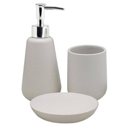 O kit contém: - 1 Dispenser para sabonete líquido - 8cm x 19cm - 1 Pote multiuso - 8,2cm x 10cm - 1 Saboneteira - 13,3cm x 10,1cm x 3cm