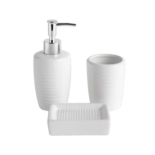 Este kit decorativo para banheiro é uma opção prática e elegante para a decoração do espaço. Com peças em cerâmica, o conjunto inclui um dispenser para sabonete líquido, uma saboneteira e um pote para organização, proporcionando beleza e organização ao ambiente.