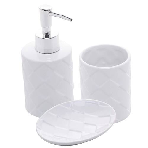 - 1 Porta sabonete líquido: 16 x 7 altura x diâmetro - 1 Porta escova: 9 x 7cm altura x diâmetro - 1 Porta sabonete em barra: 2 x 8,5 x 11cm altura x largura x comprimento