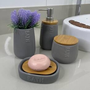 Kit Banheiro Nature Cinza 5 Peças Mai Home CUIDADOS: Lave o produto com esponja macia e sabão neutro, enxaguando com água abundante. Evite batidas.