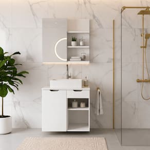 O Kit Prisma 60 Branco é a combinação perfeita para um banheiro moderno: espelheira com nichos abertos + gabinete com porta, gaveta e nicho, trazendo um conjunto harmonioso, funcional e com excelente aproveitamento de espaço.